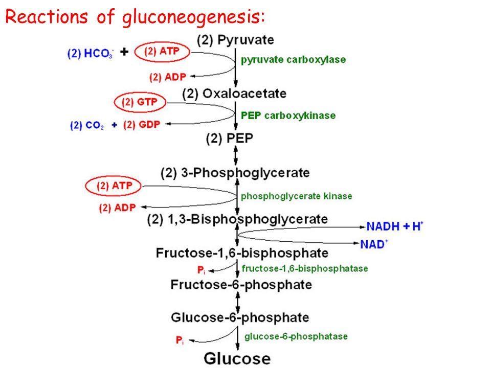 Oxaloacetate + GTP → PEP + GDP + CO₂From PEP, the pathway essentially reverses the reversible steps of glycolysis using the same enzymes, but in the reverse direction: