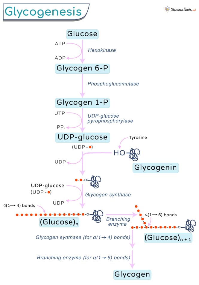 • Glycogen synthesis doesn't start from scratch. It requires a pre-existing glycogen molecule (a "primer") to which new glucose units can be added.