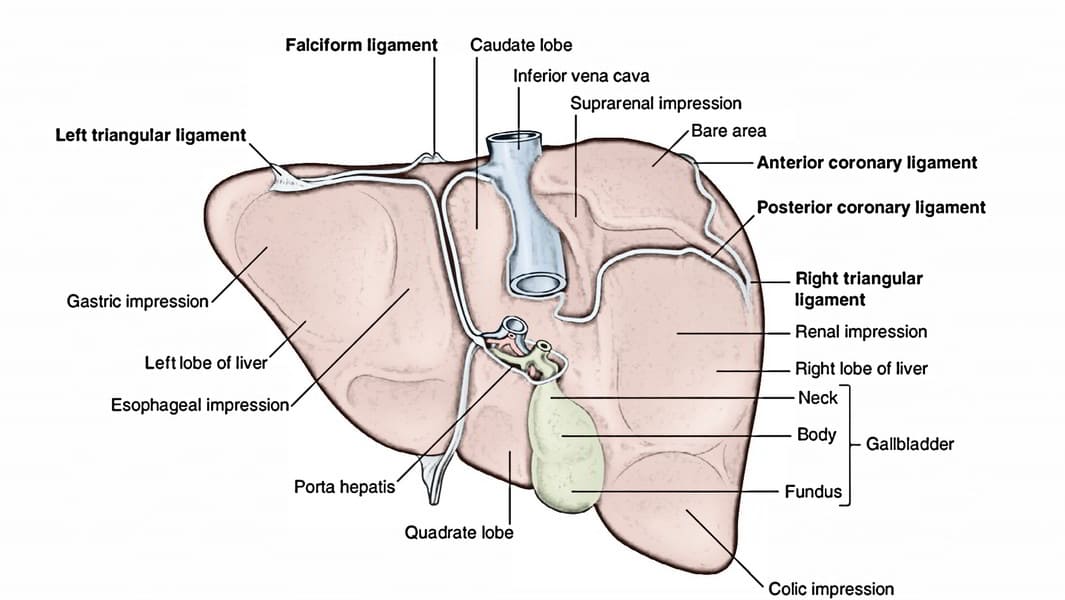 - Visceral (Postero-inferior) Surface: This irregular, concave surface is molded by the various abdominal organs it contacts (e.g., stomach, duodenum, colon, right kidney, adrenal gland).
