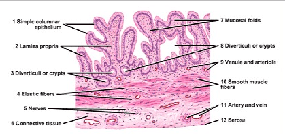 - Lamina Propria: A loose connective tissue layer beneath the epithelium, containing capillaries and lymphatic vessels involved in water absorption.