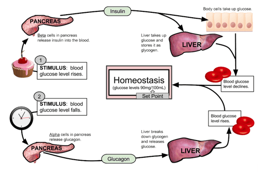 This decrease is detected by receptors in the pancreas, which responds by releasing the hormone glucagon into the bloodstream. Glucagon travels to the liver and stimulates hepatocytes (liver cells) to break down their glycogen stores and release glucose molecules into the blood. This increases blood glucose levels, opposing the original stimulus. Once glucose is restored to its normal range, the signal for glucagon release dissipates. This "off switch" is a key element of negative feedback.