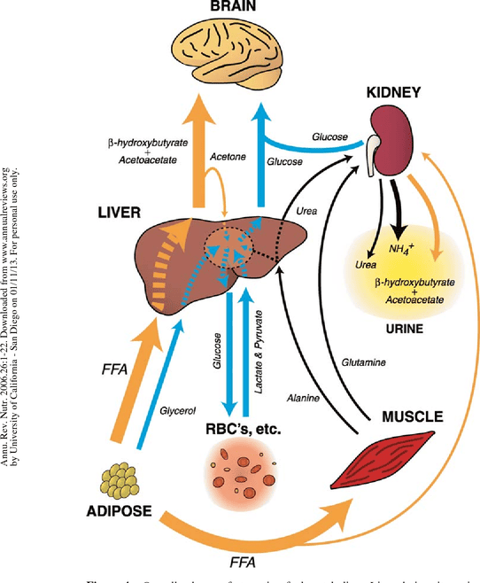 Summary of the Starved State: The starved state is characterized by extreme adaptations aimed at survival. The body shifts almost entirely to fat and ketone body metabolism to preserve its vital protein reserves. The brain becomes a major consumer of ketone bodies, dramatically reducing its glucose requirement and allowing for a significant reduction in the breakdown of muscle protein. This allows individuals to survive for extended periods without food.