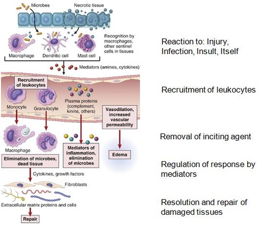 Inflammation is the response of vascularized tissues that delivers leukocytes and host defense molecules from the circulation to the sites of infection and cell damage. Its primary objective is to eliminate the offending agent.