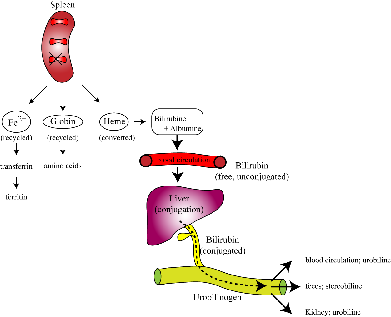 • Recycling: Hemoglobin components are broken down: globin to amino acids, iron salvaged, and heme converted to bilirubin for excretion.